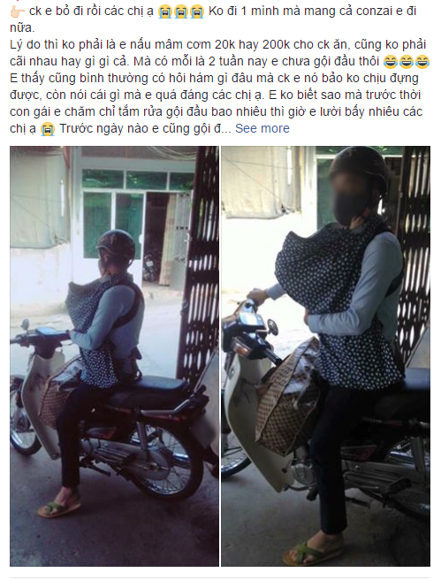 Tài khoản Y.S.L. than thở: "Chồng em bỏ đi rồi các chị ạ. Không đi một mình mà mang cả con trai em đi nữa. Lý do thì không phải là em nấu mâm cơm 20k hay 200k cho chồng ăn, cũng không phải cãi nhau hay gì gì cả. Mà có mỗi việc là hai tuần nay em chưa gội đầu thôi. Em thấy cũng bình thường có hôi hám gì đâu mà chồng em nó bảo không chịu đựng được, còn nói cái gì mà em quá đáng các chị ạ.