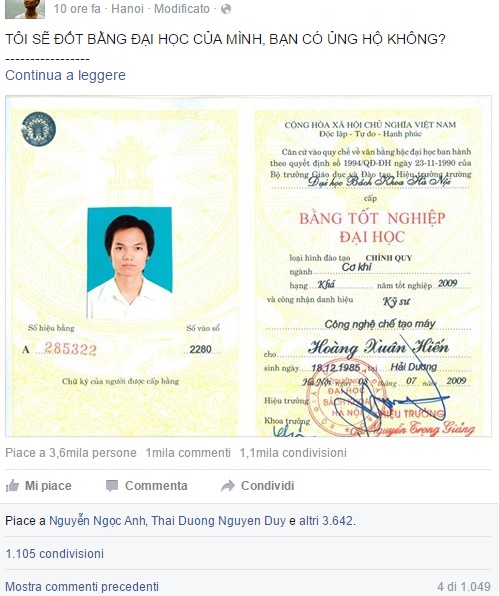 Chỉ cần 99 like, tôi sẽ đốt tấm bằng đại học của ḿnh. Tôi muốn thức tỉnh và thay đổi suy nghĩ về việc học đại học của các bậc phụ huynh và các em học sinh hiện nay.
