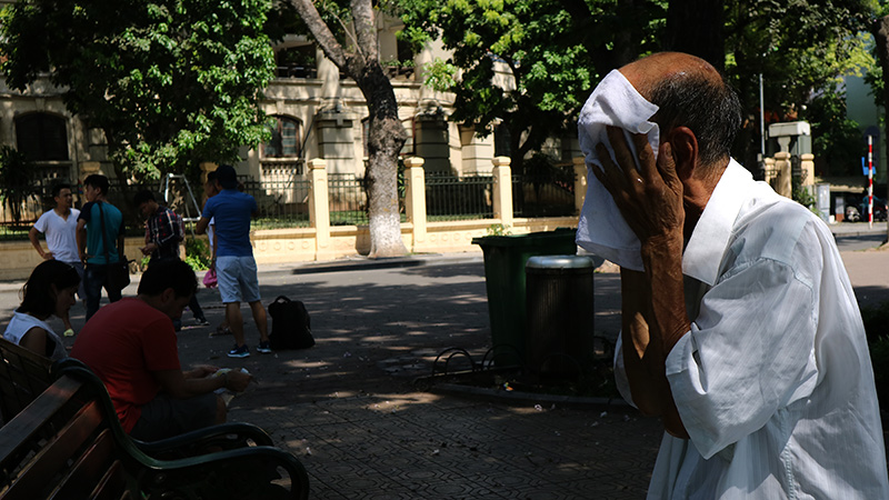 Cụ Thìn, nhà ở khu phố cổ dù đã phải ra bờ hồ Hoàn Kiếm chống nóng vẫn phải mang theo chiếc khăn thấm đẫm nước để thỉnh thoảng lau mặt cho đỡ nóng.