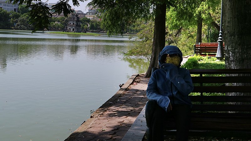 Dù đã ngồi đươi bóng mát của hàng cây ven hồ Hoàn Kiếm, người phụ nữ này vẫn phải bịt kín mặt vì những luồng gió nóng luôn phả vào mặt.