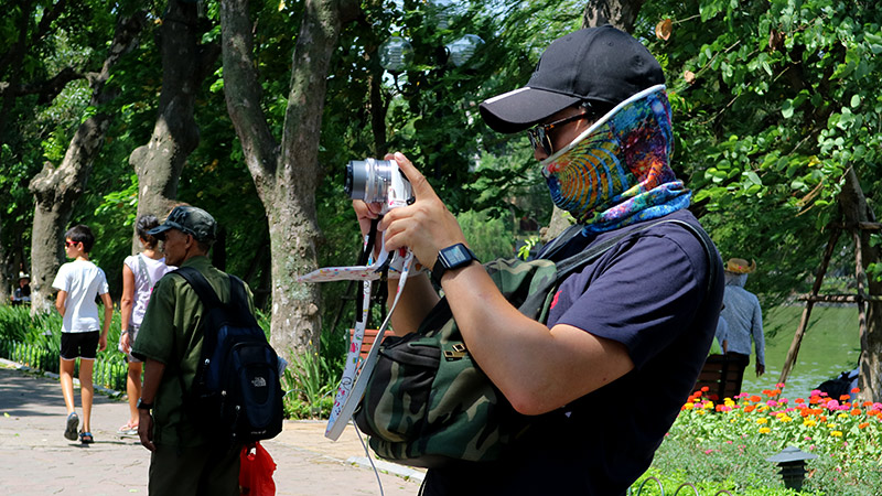 Du khách nước ngoài bịt mặt chống nóng thưởng lãm cảnh Hồ Gươm.