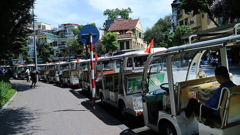 Hàng chục chiếc xe điện không có khách xếp hàng dài dưới nắng gay gắt.