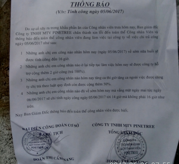 Đồng thời, phía công ty cũng có thông báo đến tất cả các công nhân của công ty về việc tính công trong ngày hôm đó (5/6).