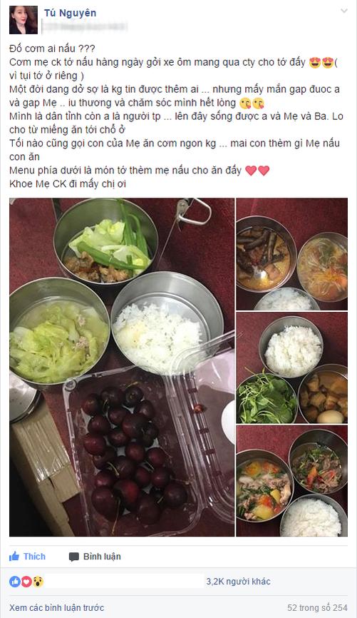 Mẹ biết mình ăn uống khó, không thể nuốt được cơm công ty, nên ngày nào cũng nấu đủ món, rồi gửi xe ôm mang qua chỗ mình làm. Đến chiều gọi lại hỏi cơm có ngon không con, mẹ nấu vậy có vừa không, thích món này món kia chứ, mai thèm đồ gì để mẹ đi chợ nấu cho...