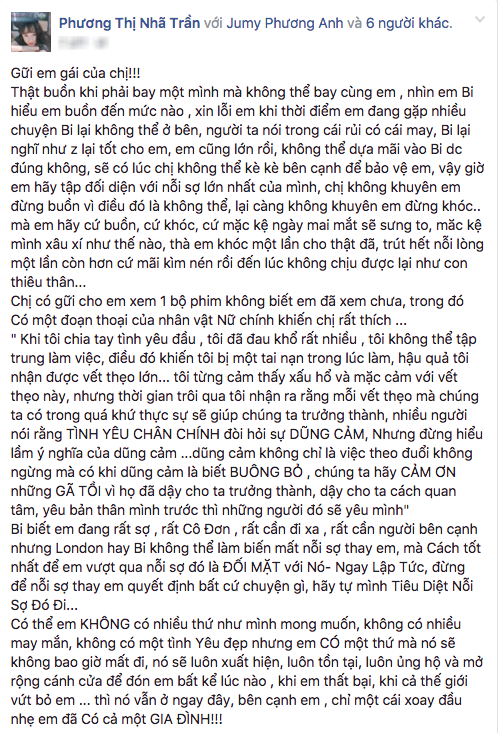 “Thật buồn khi phải bay một mình mà không thể bay cùng em, nhìn em Bi hiểu em buồn đến mức nào. Xin lỗi em khi thời điểm em đang gặp nhiều chuyện Bi lại không thể ở bên.