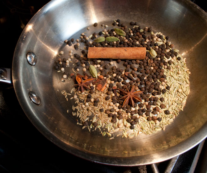 - 1 thìa cà phê hạt thì là; 1 thanh quế dài khoảng 5cm; 3 hoa hồi; 5 quả bạch đậu khấu; 6 nhánh đinh hương; 1/2 thìa cà phê rau mùi; 1/2 thìa canh hạt thì là Ai Cập; 1 thìa canh hạt tiêu đen nguyên hạt