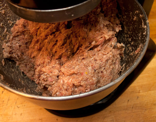 Thêm phần rượu vang ướp lạnh vào hỗn hợp thịt xay và dùng một cái thìa thật dày, cứng, chắc để trộn hỗn hợp thật đều cho đến khi nhuyễn mịn và có bề ngoài đồng nhất (khoảng một phút).