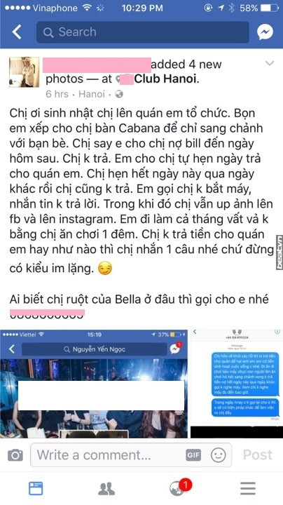 Mới đây, trên facebook của 1 bạn nam được cho là quản lý quán bar có tiếng tại Hà Nội có đăng bài viết bóc "Phốt" 1 hot girl khá quen mặt trong giới ăn chơi Hà Thành.
