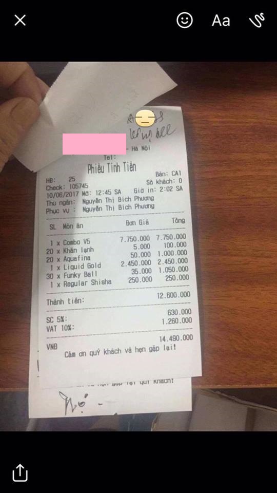 Trong bài viết, chủ nhân chia sẻ cách đây 2 tháng "hot girl" NGọc Te có đến bar mình làm vui chơi cùng chúng bạn. Sau khi dẩy đầm, hút bóng choẽ mồm phê quên trời đất. Hot girl liền gục xuống bàn, say không biết gì cả, quản lý và nhân viên gọi mãi cũng không dậy thanh toán.