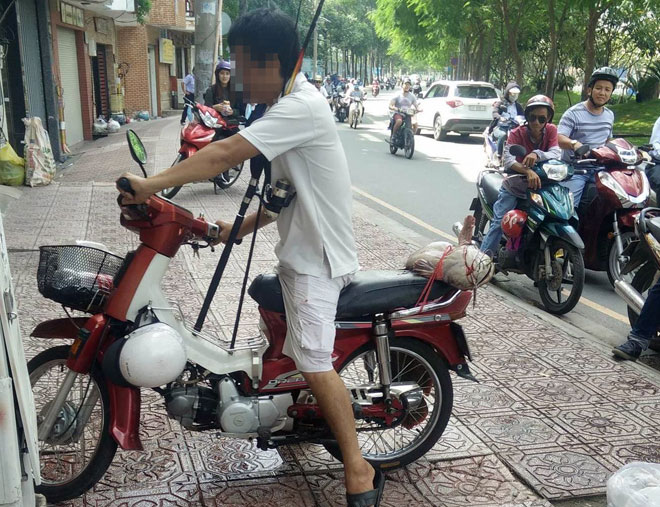 Ngay khi bắt được cá “khủng” giữa Sài Gòn, người đàn ông nhanh chóng thu cần buộc cá vào xe máy và rời đi.