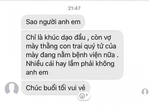 Điều đáng nói là ngay sau khi vụ việc xảy ra, một tài khoản facebook tên H.H. đã nhắn tin cho anh Sin với nội dung “Sao người anh em, chỉ là khúc dạo đầu. Còn vợ mày, thằng con trai của mày đang nằm bệnh viện nữa. Nhiều cái hay lắm phải không anh em. Chúc buổi tối vui vẻ”.