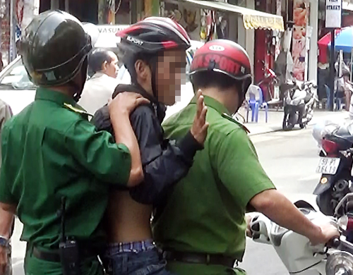 Thân hình còm cõi, hai cánh tay chằng chịt các nốt thâm đen, miệng sùi mảng trắng, Quân ngả người trên ghế đá. Mắt vẫn nhắm nghiền, anh ta vùng dậy khi bất ngờ bị công an bắt giữ cùng 3 người ở gần đấy, đưa về trụ sở.
