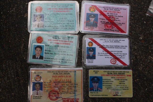 Qua kiểm tra, CSGT Bắc Giang thu giữ từ Quỳnh 3 túi ni lông chứa tinh thể màu trắng nghi là ma túy “đá” có khối lượng khoảng 30 gam, 1 viên nén màu xanh dương nghi là thuốc lắc, 1 ví bên trong có hơn 6 triệu đồng.Ngoài ra, Quỳnh còn mang theo 2 giấy chứng minh nhân dân, 2 giấy phép lái xe, 1 thẻ thanh tra giao thông vận tải, 1 thẻ kiểm tra giao thông vận tải đều mang tên Nguyễn Văn Quỳnh. Bên cạnh đó có nhiều giấy tờ đã đóng dấu sẵn của ngành giao thông vận tải cấp cho Nguyễn Văn Quỳnh, 6 thẻ hội viên hội nạn nhân chất độc màu da cam/dioxin Việt Nam.