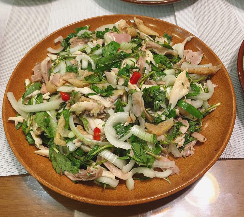 Làm gỏi quan trọng nhất là phần nước trộn, có thể làm theo công thức sau: 3 thìa nước mắm, 3 thìa nước sôi để nguội, 2 thìa nước cốt chanh, 1 thìa đường, 2 quả ớt rồi khuấy đều lên. Cuối cùng đổ phần nước trộn này vào hỗn hợp thịt gà, hành tây, rau răm đảo thật đều cho ngấm. Khi ăn rắc thêm một chút tiêu cho dậy mùi.