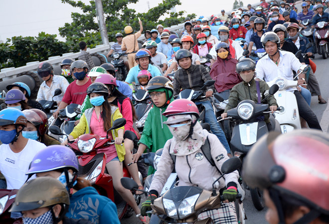 Xe cộ qua cầu Bình Phước ùn tắc nghiêm trọng. Ảnh: Thái Linh.