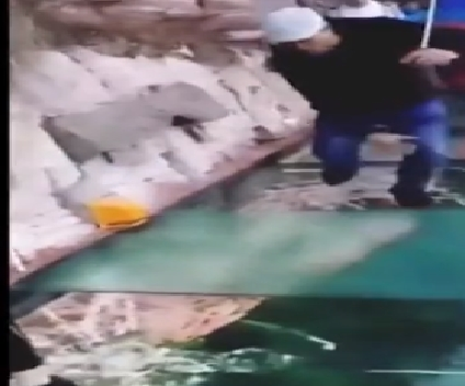 Đoạn video ghi cảnh một hướng dẫn viên du lịch bất ngờ hét lớn, ngồi sụp xuống khi thấy mặt kính vỡ nứt. Tuy nhiên đây chỉ là một trò đùa đến từ hiệu ứng được lắp đặt trên hệ thống cầu kính ở núi Taihang, Hà Bắc, Trung Quốc.