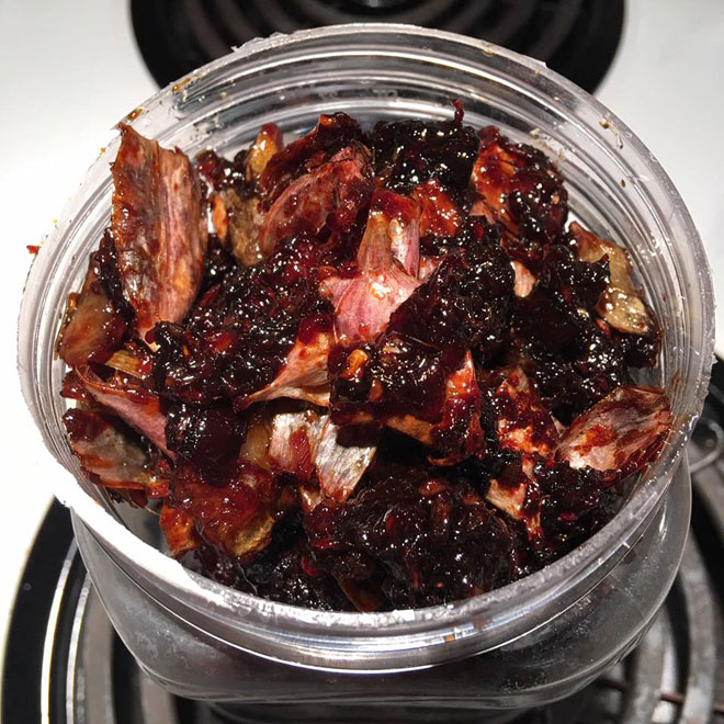 - Để thịt bò thật nguội rồi cho vô hộp cùng với phần nước sốt và tỏi đã nấu kẹo lại