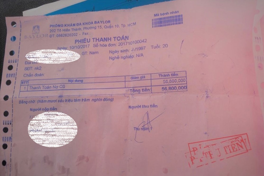 “Vì chỉ định đến để làm tiểu phẫu cắt bao quy đầu, hai vợ chồng tôi chỉ gom được 10 triệu để mang đi. Sau khi nhận phiếu thu, vợ tôi phải chạy từ quận 10 về Hóc Môn để mượn tiền mẹ tôi gần 40 triệu đồng mang đến đóng. Mẹ tôi cũng không có tiền mà phải gấp rút đi mượn bà con. Trong lúc đó, phòng khám giữ tôi lại để…hồi sức” - Anh T ấm ức kể.