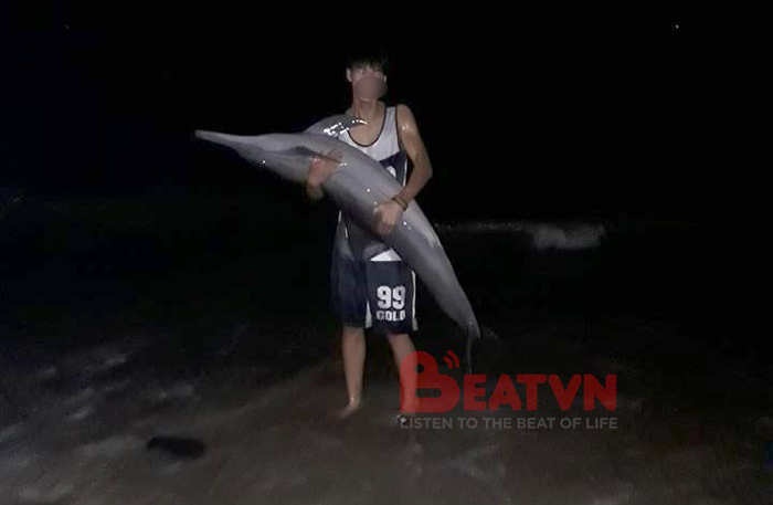 Nhóm thanh niên lại gần, bế chú cá heo lên chụp ảnh rồi thả lại ra biển để chú bơi đi. Thế nhưng, sáng sớm nay, chú cá heo bị dính vào lưới của người khác và lại bị vớt lên bờ. Lần này chú không may mắn như đêm qua mà bị bắt lên bờ xẻ thịt, đã thế còn bị chụp ảnh đăng lên facebook.