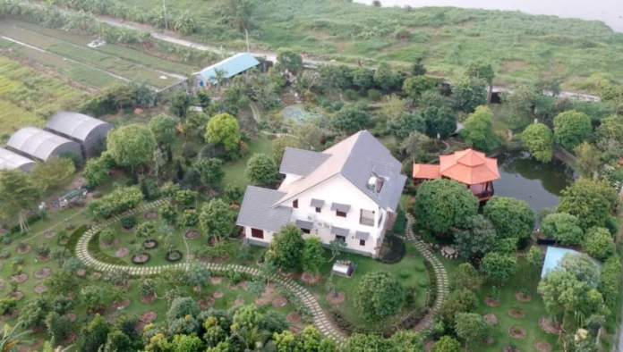 Căn “biệt phủ” được xây dựng khá lớn, có nhà thủy tạ dùng để hóng mát, tiếp khách ngoài trời, bao quanh là thảm cỏ xanh mướt, có tường rào bao quanh, cổng cao hơn 2 mét và cửa ra vào đối diện bờ sông.