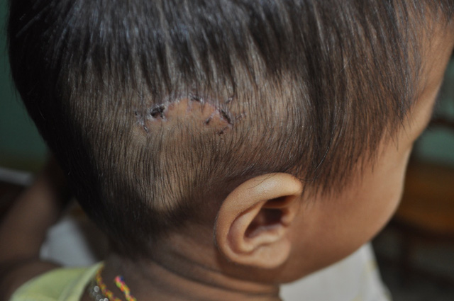Nhìn con ốm yếu, xanh xao anh chị không khỏi xót xa. Chị kể, cách đây hơn 2 tháng cháu nó cứ ói suốt, gia đình đưa đi nhiều bệnh viện nhưng bác sĩ kết luận chỉ là bệnh viêm dạ dày. Nhưng chạy chữa 1 tháng tình trạng sức khỏe vẫn không cải thiện. Lo lắng, gia đình vội đưa cháu đến Bệnh viện Hoàn Mỹ (Đà Nẵng) thăm khám. Tại đây bác sĩ cũng kết luận cháu bị dạ dày, chạy chữa được 2 ngày không khỏi mới cho làm thêm các xét nghiệm lúc đó phát hiện cháu bị u lao màng não (u vùng hố sau/giãn não thất).