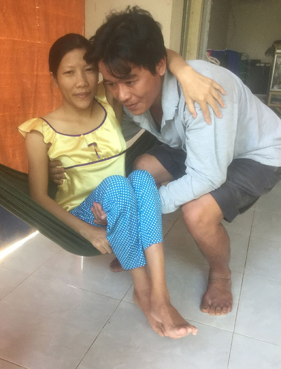 Men theo con đường đất, chúng tôi về nhà anh. Người phụ nữ đang ngồi trên võng nở nụ cười. Anh giới thiệu, đó là vợ anh, tên Nguyễn Thị Tuyết Mai, 30 tuổi.