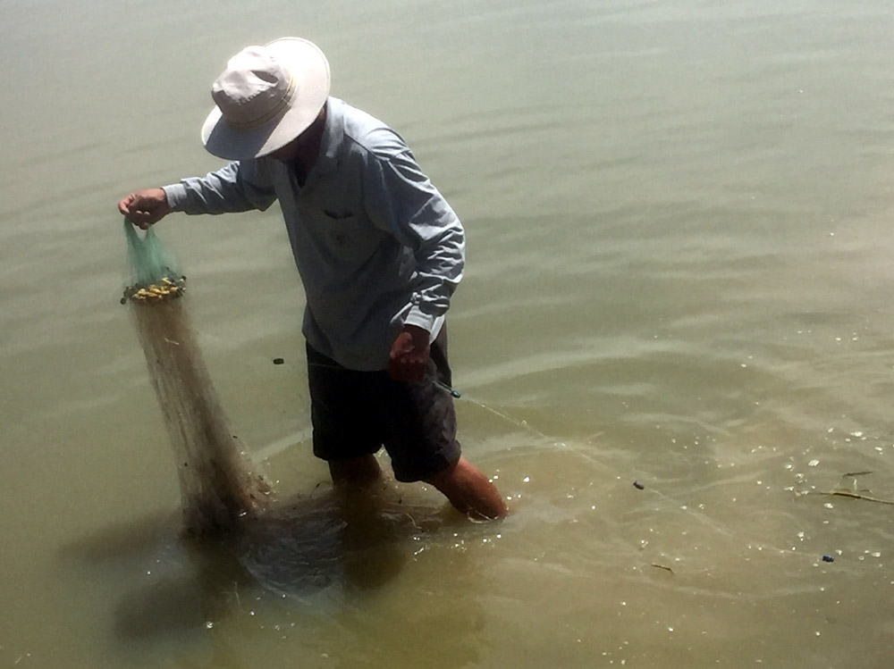 Vì đang mùa nước nổi, cánh đồng ấp Cây Me (xã Hưng Điền, Tân Hưng, Long An) lênh láng nước. Giữa trưa nắng, một người đàn ông trung niên lầm lũi giăng lưới. Móc đầu lưới ở mép bờ ruộng, anh thả chiếc lưới dài cả vài chục mét...