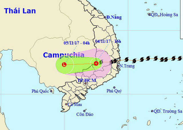 Dự báo trong 12 giờ tới, áp thấp nhiệt đới tiếp tục di chuyển theo hướng Tây, mỗi giờ đi được 15-20km, đi sâu vào đất liền và suy yếu thành một vùng áp thấp trên khu vực Campuchia.