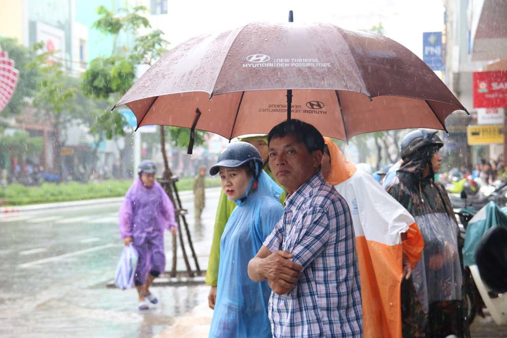 Bên cạnh đó, bất chấp mưa lớn, hàng ngàn người dân vẫn che dù, mặc áo mưa đổ ra đường đón đoàn xe “khủng” đến từ nước Mỹ. Dọc tuyến đường Nguyễn Văn Linh, từ 10 giờ 30 đến 13 giờ đã có rất đông người dân đứng hai bên đường đón chờ đoàn xe chuyên phục vụ tổng thống Mỹ. Anh Nguyễn Đắc Hà, trú P.Hải Châu 1, Q.Hải Châu, cho biết: “Trời mưa, bụng thì đói nhưng tôi đứng chờ để được tận mắt nhìn thấy chiếc “quái thú” của Tổng thống Mỹ Donald Trump một lần cho thỏa thích. Chứ có khi cả đời không được thấy.”