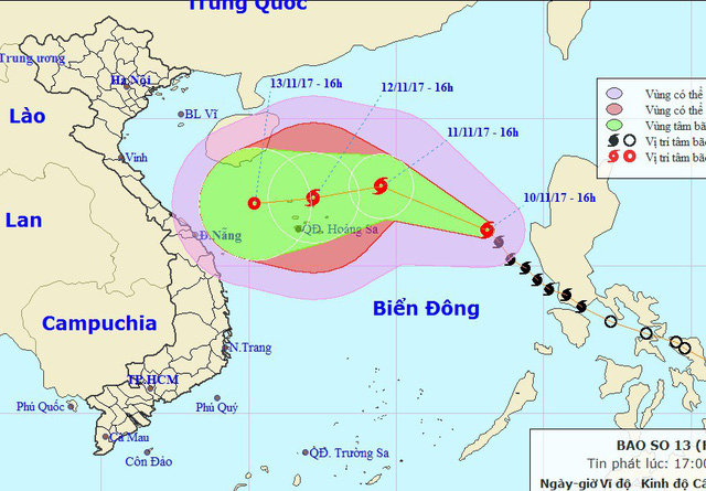 Theo Trung tâm Dự báo Khí tượng thủy văn Trung ương, hồi 16h ngày 10/11, vị trí tâm bão ở vào khoảng 16,2 độ Vĩ Bắc; 118,1 độ Kinh Đông cách quần đảo Hoàng Sa khoảng 710km về phía Đông Đông Nam. Sức gió mạnh nhất ở vùng gần tâm bão mạnh cấp 8 (60-75km/giờ), giật cấp 10. Vùng gió mạnh trên cấp 6, gió giật mạnh trên cấp 9 có bán kính khoảng 110km tính từ vùng tâm bão.
