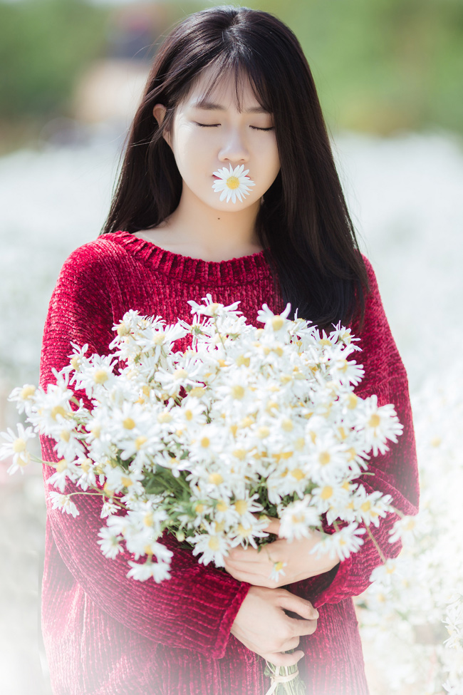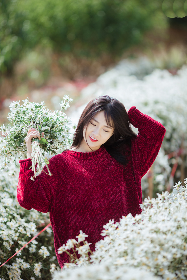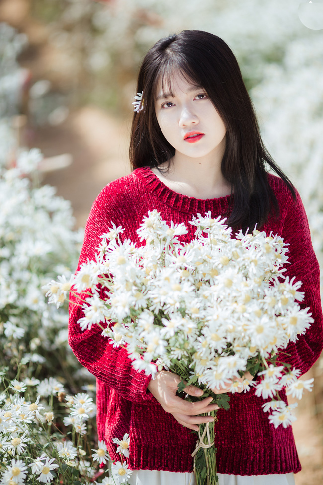 Nguyễn Hoàng Kiều Trinh - được biết đến bởi danh xưng "cô bé trà sữa" từ TP.HCM cũng bay ra Hà Nội để có bộ ảnh kỷ niệm tuổi 23 bên cúc họa mi.