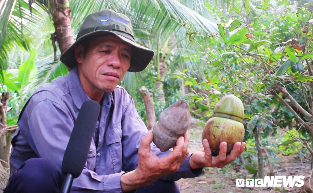 Theo ông Phúc, nguyên nhân khiến dừa bị rụng là do lúc mưa nhiều, vườn dừa thấp bị ngập, rồi lại có thời gian nắng mưa thay đổi đột ngột khiến cây khó thích nghi được dẫn đến thối úng, rụng hàng loạt.