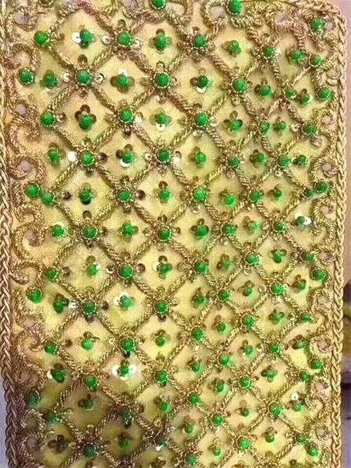 Váy cưới của cô dâu và chiếc khăn choàng truyền thống, tất cả đều được làm thủ công. Vải dệt bằng chỉ vàng, thêu cũng bằng chỉ vàng. Những viên ngọc tuyệt đẹp cũng được gắn lên theo phương thức thủ công, từng viên một.