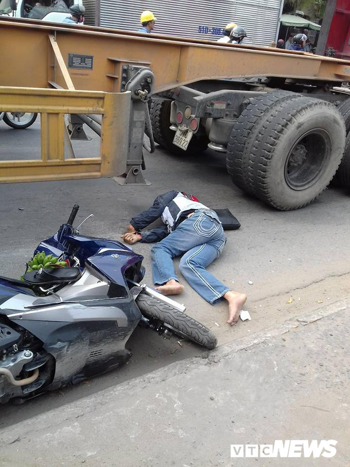 Luống cuống, người đàn ông lái xe máy leo lên vỉa hè để tránh xe container nhưng do lề đường quá cao khiến người này ngã ngược xuống lòng đường. Sau khi ngã xuống đường, nạn nhân bị chính xe container ép vào lề cán qua người, chết tại chỗ.