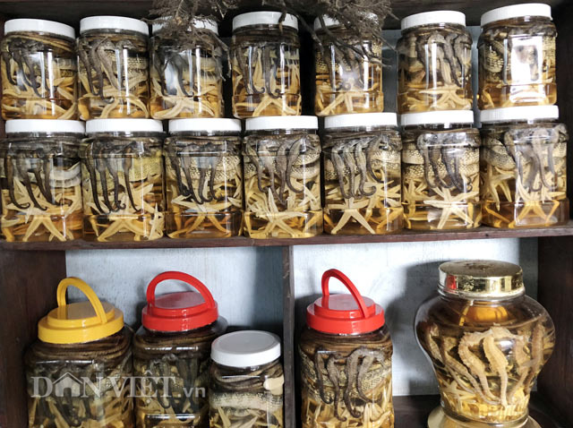 Đưa tay chỉ hũ rượu cá ngựa hơn 20 con, trong đó con nhỏ nhất cũng to gần 2 ngón tay người lớn được ngâm cùng sao biển, đẻn (rắn biển) trưng trong tủ kiến phòng khách của gia đình, ông B, chủ một doanh nghiệp xây dựng ở TP. Quảng Ngãi cho biết.