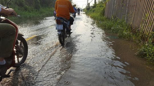 Sáng 4-2, triều cường gây ngập ở khu vực quận 9, TP HCM khiến giao thông đi lại khó khăn.