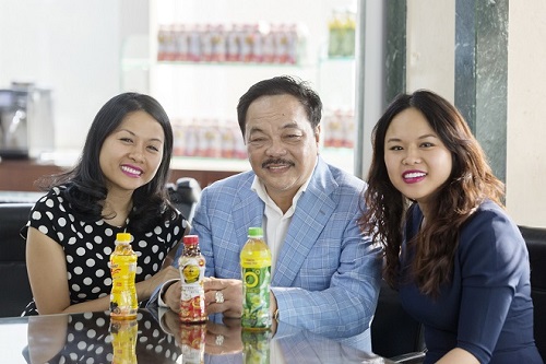 Ông Trần Quí Thanh (giữa) cùng hai con gái, Trần Uyên Phương (trái) và Trần Ngọc Bích (phải). Hai ái nữ của ông chủ Tân Hiệp Phát đảm nhiệm những vị trí quan trọng trong công ty gia đình. Ảnh: THP