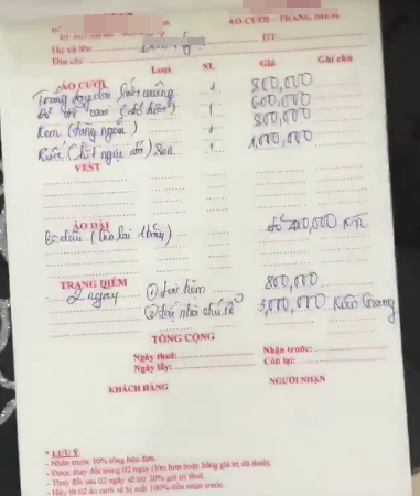 Theo chia sẻ của chủ cửa hàng áo cưới, cô gái này tự nhận mình tên N., nhà ở Phù Đổng và chuẩn bị lấy chồng ở Kiên Giang. Sáng hôm đó, cô gái này đến cửa hàng từ khá sớm để thuê đồ cưới. Sau khi thử 10 chiếc váy cưới thì cô nàng quyết định thuê 4 chiếc váy kèm thêm dịch vụ về Kiên Giang trang điểm tận nhà cho cô dâu. Hóa đơn đã ghi đầy đủ và đến ngày thì ekip xuống Kiên Giang như đã hẹn.