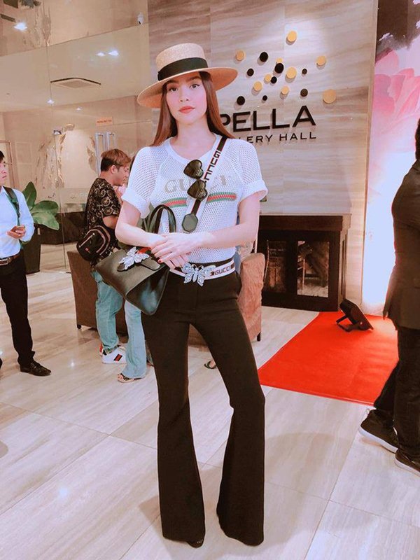 Được biết, thiết kế này thuộc BST Gucci Cruise 2018 Collection vừa được trình làng cách đây không lâu. Chiếc áo khá đơn giản với họa tiết in logo nhưng mang lại hiệu ứng thẩm mỹ cao cho người mặc. Nếu Kim Lý diện áo phông với quần ống suông mang phong cách cổ điển thì Hà Hồ cao tay hơn khi kết hợp cùng quần ống loe, điểm nhấn thú vị cùng thắt lưng hình bướm đính hạt và một đôi giày cao gót tôn dáng.