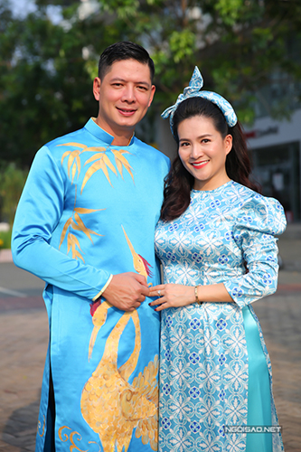 Cả gia đình nam diễn viên mặc áo dài ton-sur-ton màu xanh da trời.