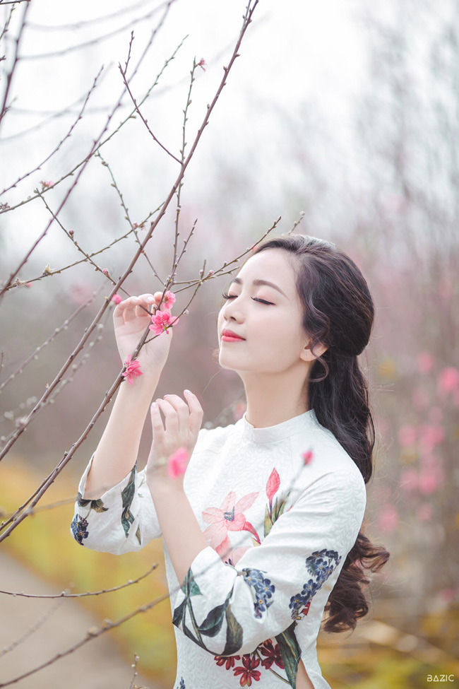Cô giáo trẻ diện áo dài trắng in hoa, nổi bần bật giữa vườn đào đang khoe sắc.