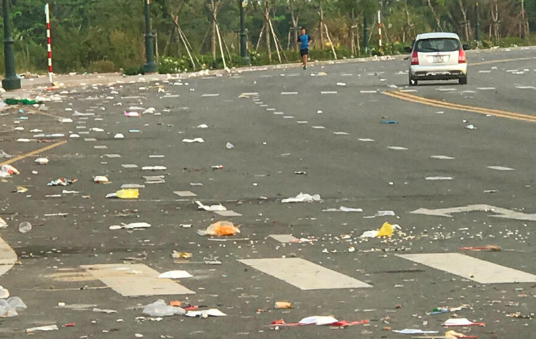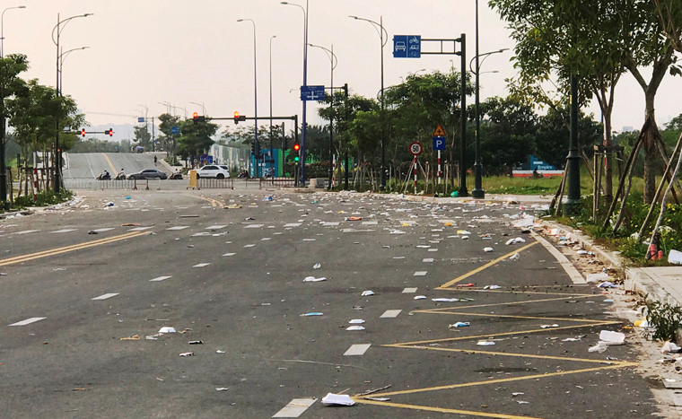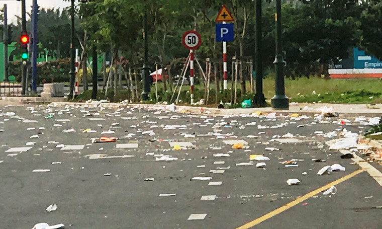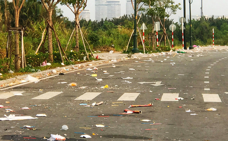 Sau đêm giao thừa Tết Mậu Tuất 2018 ở TP.HCM. Cả tuyến đường trong khu đô thị mới Thủ Thiêm, quận 2, TP.HCM tràn ngập rác. Chứng kiến cảnh tượng rác thải thật khủng khiếp.
