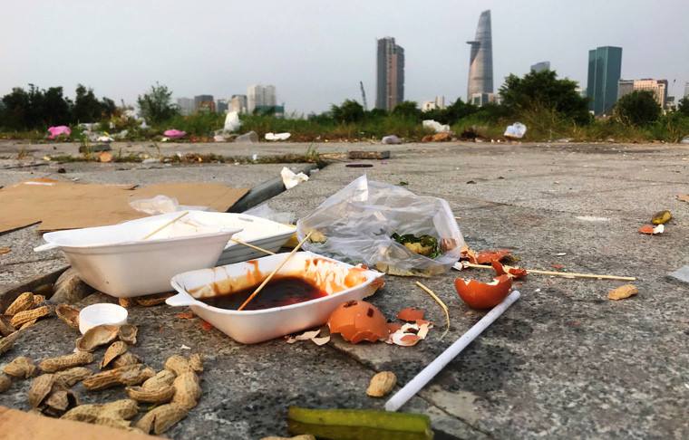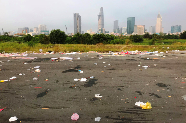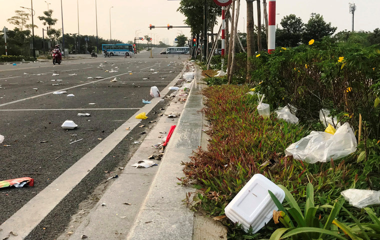 Đến sáng mồng 1 Tết, cả tuyến đường Ven Hồ Trung Tâm, trong Khu đô thị mới Thủ Thiêm (quận 2, TP.HCM) còn ngập trong đủ loại rác thải.