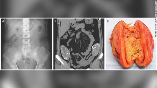 Đó là kết quả sau khi chụp X-quang và chụp cắt lớp CT cho thấy có hai băng gạc y tế nằm trong ổ bụng người này.