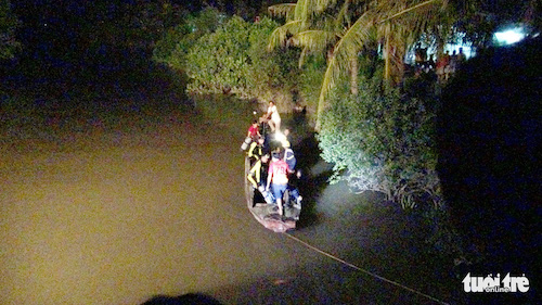 Lực lượng tìm kiếm, cứu hộ cứu nạn Công an tỉnh Vĩnh Long tham gia lặn tìm thi thể cháu Nhân.-Ảnh: CHÍ HẠNH