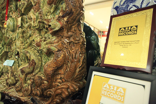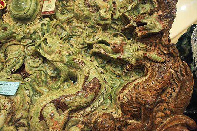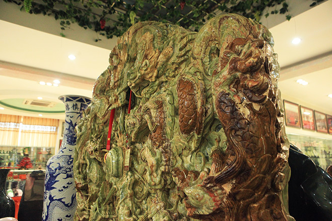 Đây là bức tranh bằng ngọc nguyên khối. Hiện nó được trả giá đến 10 tỷ đồng. Nó là một kiệt tác bằng ngọc Pakistan nguyên khối nặng hơn 2 tấn, bức tranh mô tả sống động hình ảnh 9 con rồng châu Á đang uốn lượn trên mây cùng tranh một viên ngọc.