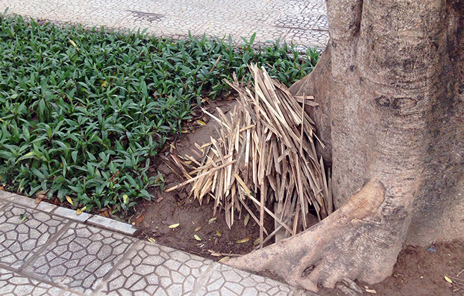 Theo những người dân sinh hoạt xung quanh hồ Giảng Võ, việc cắm cọc tre chi chít trên vườn hoa đã có từ vài ngày nay. “Từ hôm nhân viên cây xanh đến trồng cây, hoa mới thì họ cũng cắm luôn nhiều cọc tre vót nhọn xen giữa thảm cỏ. Tôi có hỏi thì họ lý giải là để khỏi bị chó hoang nhảy vào phá phách”, bà Thoan (bán hàng nước ven hồ) cho biết.