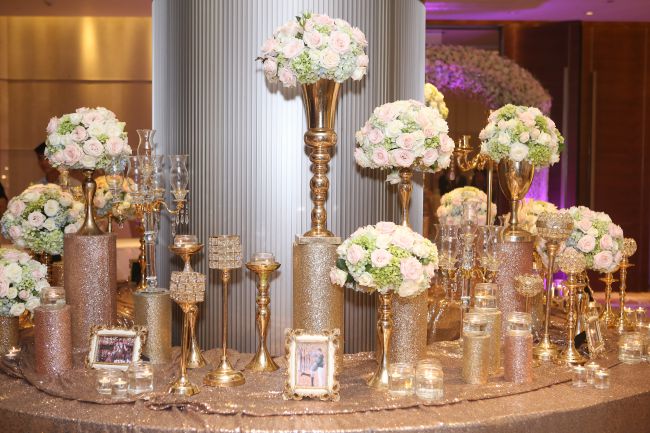 Không gian lễ cưới được vợ chồng Tố Ny trang trí với tông màu trắng, vàng làm chủ đạo, với hoa tươi được phủ kín tại sảnh tiệc.