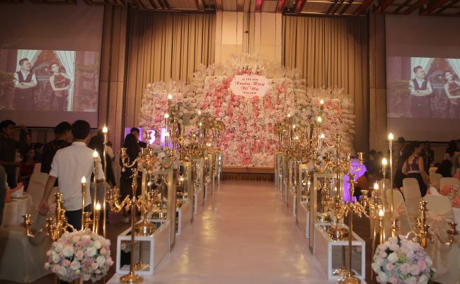 Lễ đường được trang trí sang trọng với ánh nến và hoa trải khắp tạo không khí lãng mạn, ấm cúng.