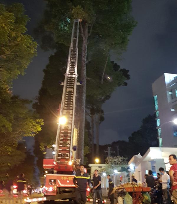 Các chiến sĩ mặc đồ bảo hộ, cầm đuốc cháy đỏ rực, ngồi vào thang và di chuyển lên các cành cây cao khoảng 30 m. Khi thấy tổ ong, cảnh sát dùng đuốc đốt và cắt tổ đưa xuống đất, mật ong được đặt vào trong thau.